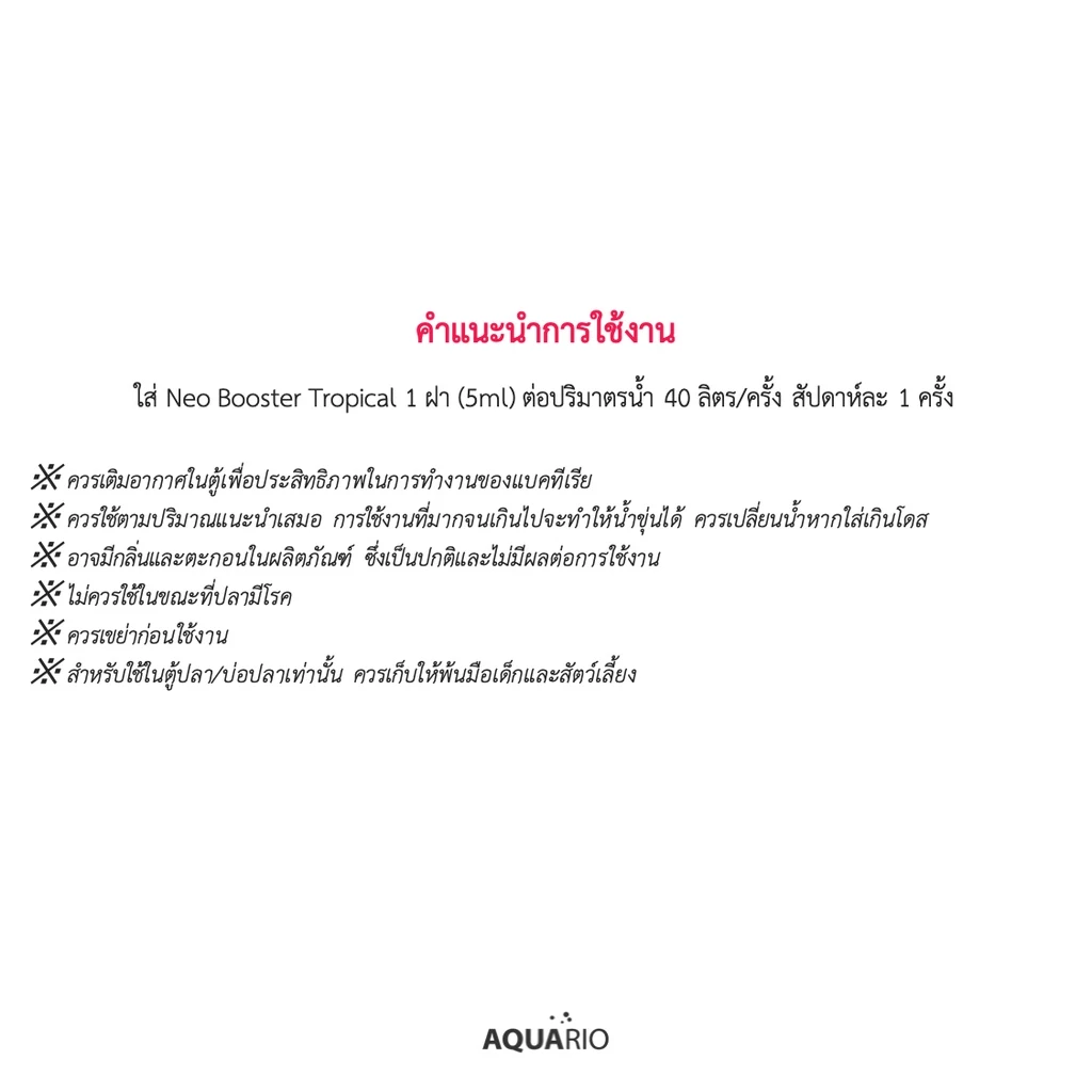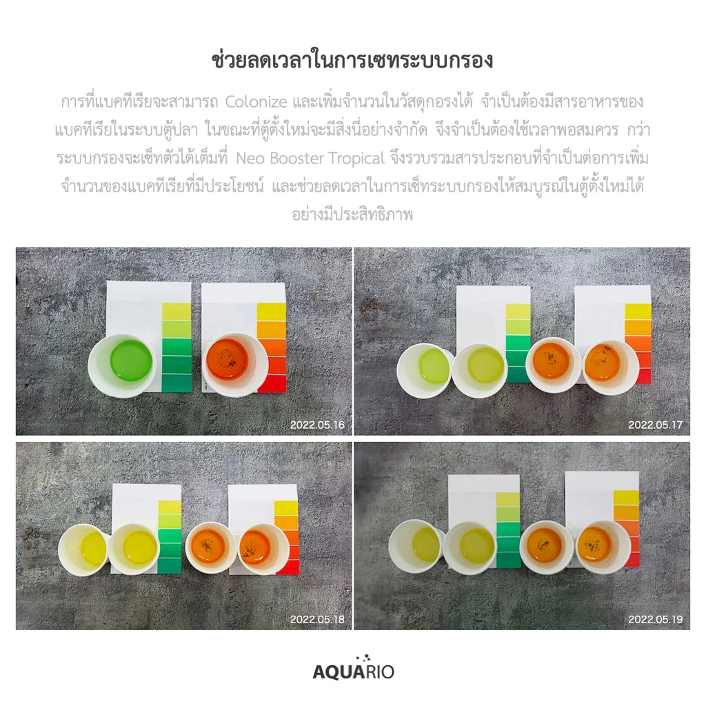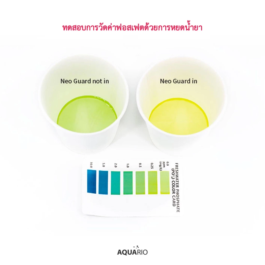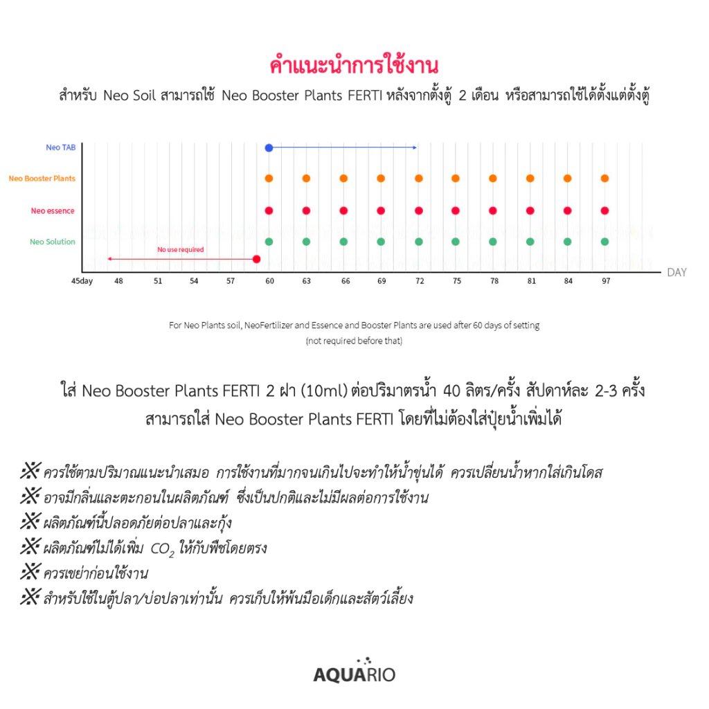 ใส่ Neo Black 1 ฝา (5ml) ต่อปริมาตรน้ำ 40 ลิตร/ครั้ง เมื่อต้องการลด pH ในน้ำ
